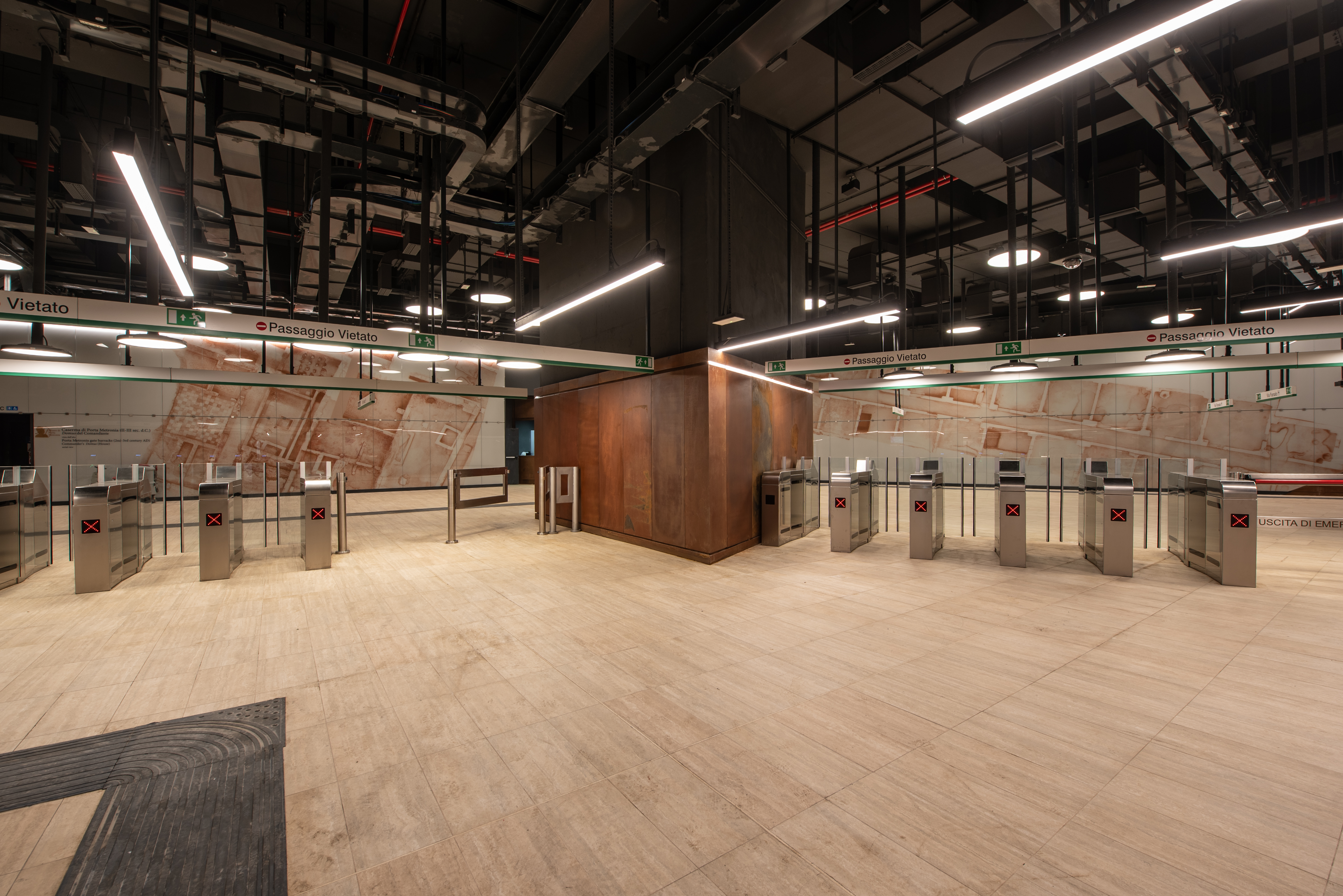 The 10 pre-existing stations of the Termini-Pantano railway have been modernized according to the technological and architectural standards of the new Line, adapting their functional and plant characteristics. The Graniti Station has been open to the public since November 9, 2014.
