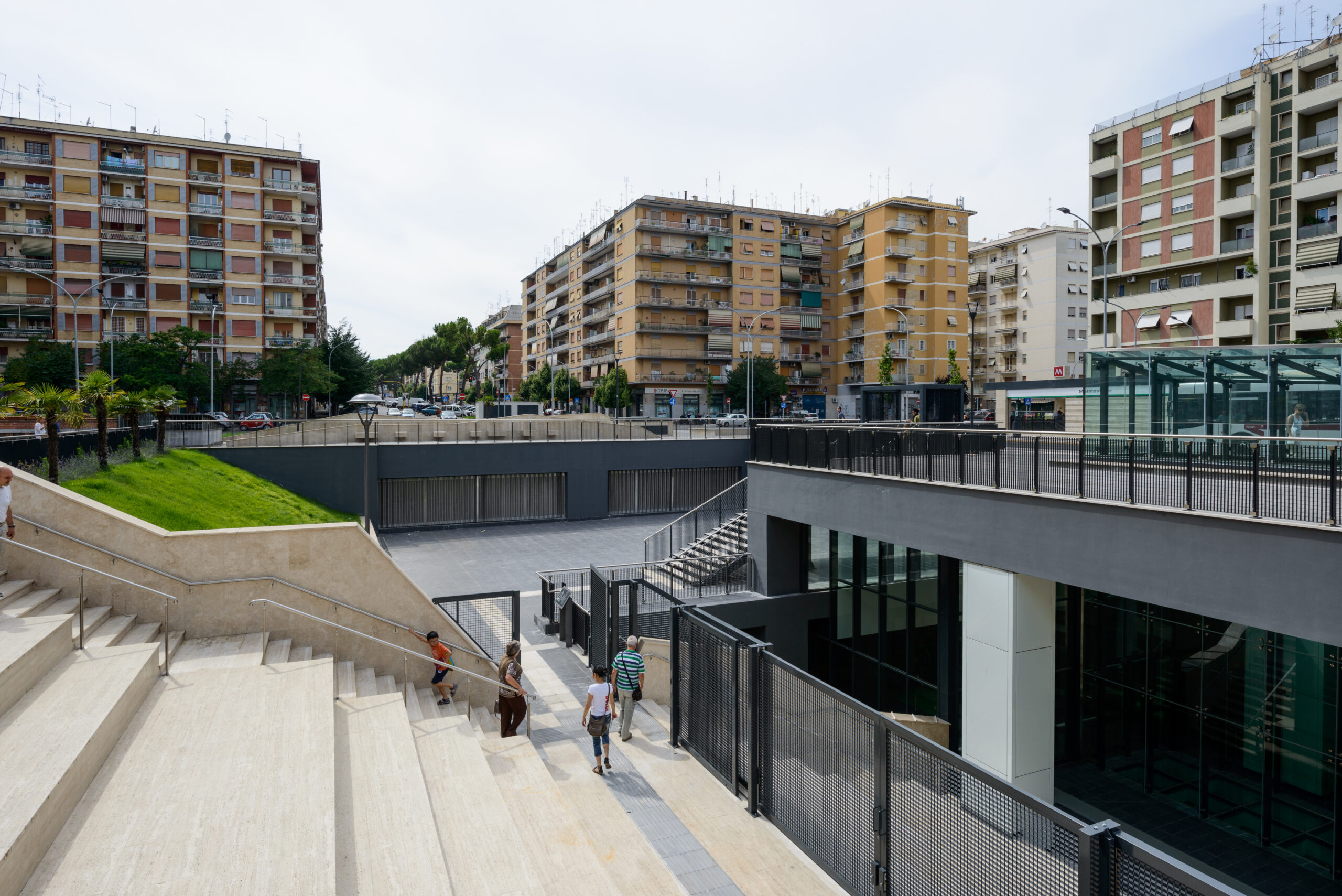 Lo spazio superficiale è caratterizzato fortemente da tre importanti emergenze architettoniche, le coperture delle scale che sono ubicate due a nord, in posizione contrapposta, a chiudere idealmente il perimetro della grande piazza, l’altra ad est sulla testata dell’aiuola spartitraffico di via R. Malatesta lato via Acqua Bullicante che diventa così un percorso pedonale attrezzato che porta gli utenti verso l’ingresso alla linea metropolitana. Centralmente la piazza a livello stradale, di forma pressocché rettangolare, si affaccia su una piazza ipogea raggiungibile a nord dal lato del capolinea degli autobus tramite due scale l’una parallela all’altra perpendicolare all’asse di stazione. Sul lato opposto, a sud, si è creata un’ampia gradonata, fiancheggiata da una più comoda scala, che costituisce un approccio meno frettoloso alla piazza sottostante creando contemporaneamente un’ampia zona di sosta.